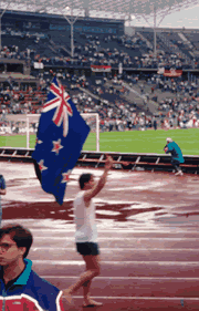 Neuseeland-Fahne - rennt ne Ehrenrunde - und gibt sie in der gegenüberliegenden